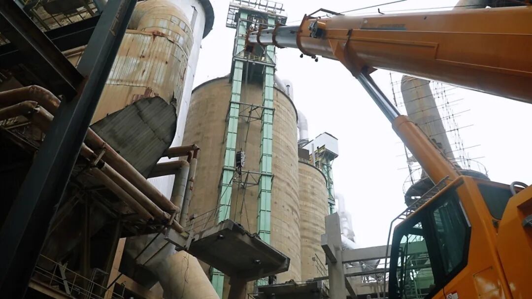 30米高、6米長(zhǎng)、5米寬,18到30噸的水泥框架,拆它本就棘手。偏偏場(chǎng)地還受限——后支腿要給旋轉(zhuǎn)配重騰地兒,前臉距離緊湊,頭頂管道壓著,大臂根本伸不開。