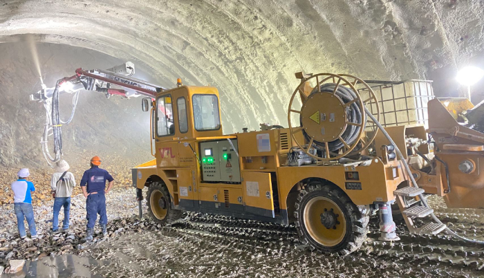 越南某隧道施工現(xiàn)場(chǎng),三臺(tái)徐工混凝土噴漿車正在進(jìn)行一場(chǎng)“雙向奔赴”式施工。