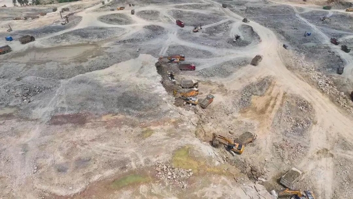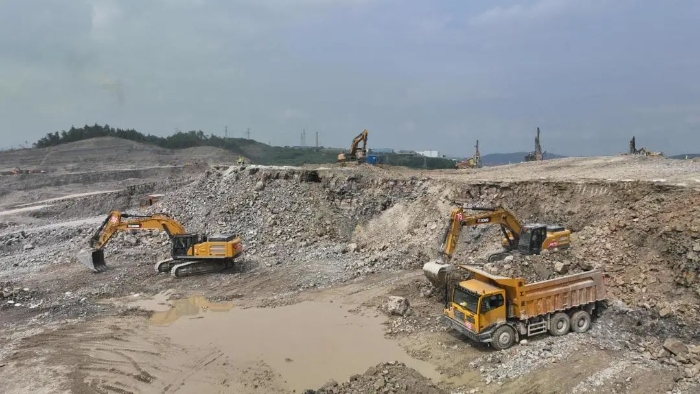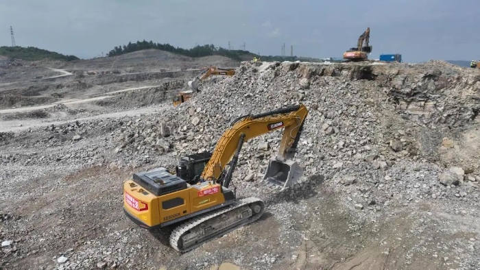 前期爆破剝離工序后,徐工20噸挖掘機(jī)搭配140的小破碎錘進(jìn)行二破,同時XE380GK、XE600GK等機(jī)型進(jìn)行挖裝作業(yè)?,F(xiàn)場共投入挖掘機(jī)50多臺,每天的挖方量在10萬方左右。