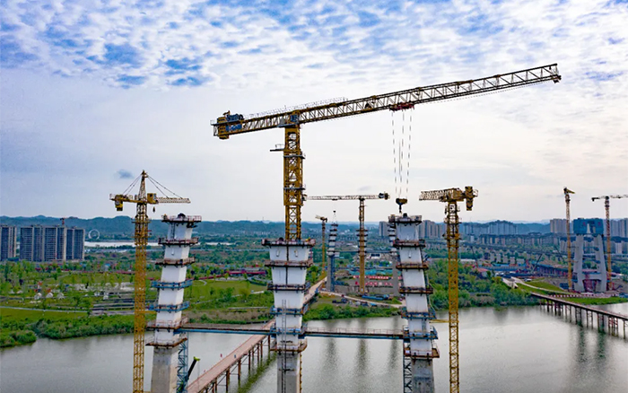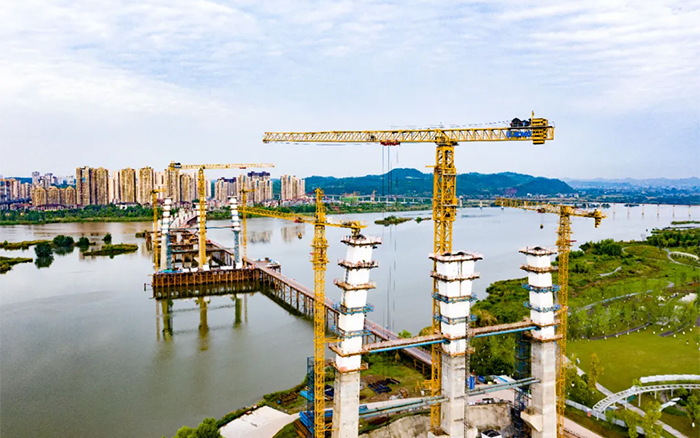 涪江六橋項目施工難度大、安全風險高,塔柱節(jié)段構造復雜,異形塔柱節(jié)段需要塔機吊裝時能靈活轉向,同時施工材料距離橋面安裝高度較高,各鋼結構更需要精準對接,運行平穩(wěn)精準、吊裝能力強的XGT1350-64S、XGT6015-8S1成為項目的不二之選。