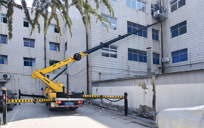 在現(xiàn)場可以看到,GKS28D結(jié)構(gòu)緊湊,整車尺寸小,能在小區(qū)狹窄道路內(nèi)穿梭自如;作業(yè)斗將鋼架物料和一名施工人員平穩(wěn)快速運(yùn)送至起始作業(yè)點(diǎn)位,從右至左依次安裝鋼架,設(shè)備作業(yè)幅度覆蓋整排樓體外立面,可輕松到達(dá)指定位置;同時(shí),無線遙控器能夠幫助檢修人員“無死角”觀察到作業(yè)平臺(tái)位置,大大提高了移動(dòng)效率和精準(zhǔn)度。