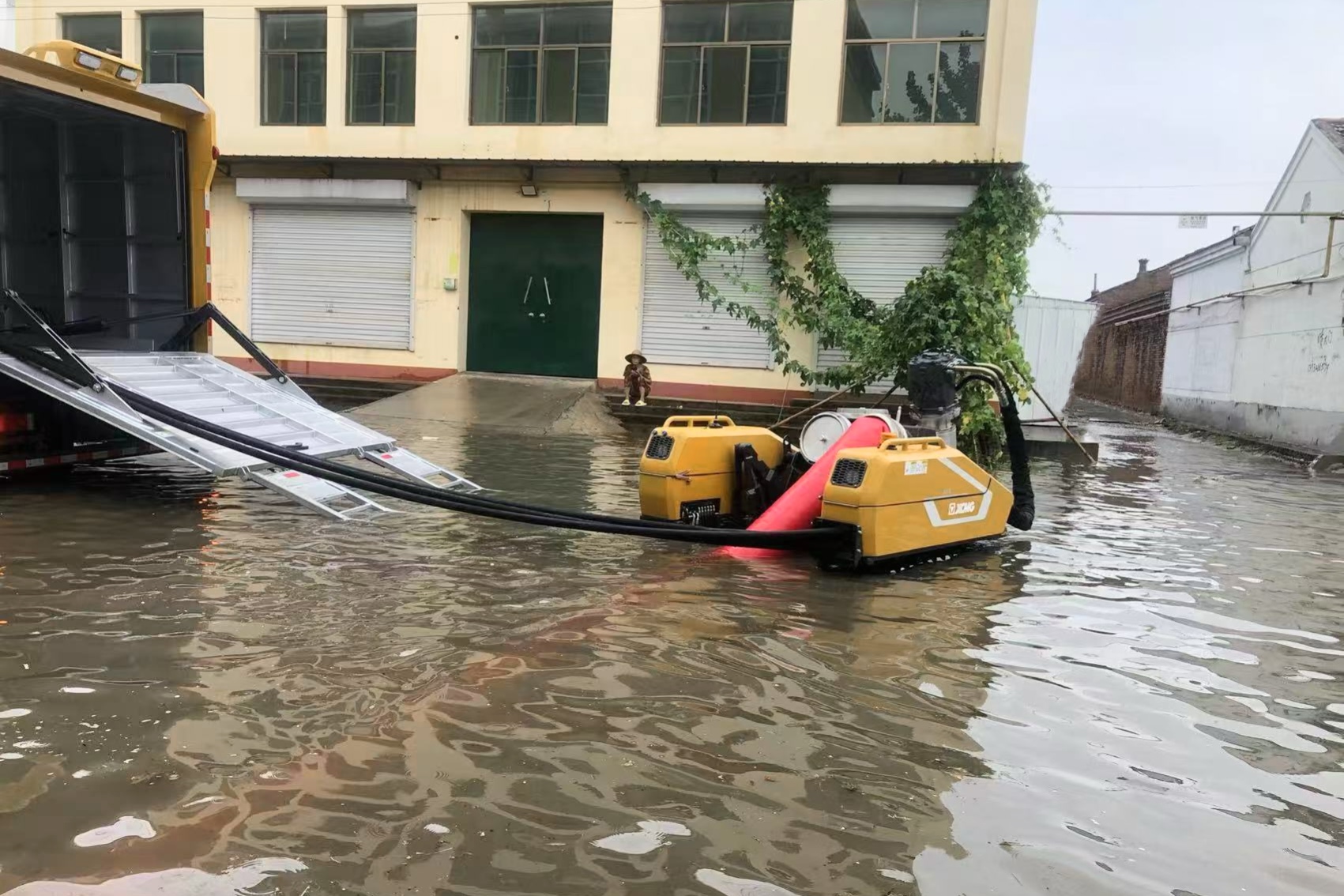 首日,車輛到達現(xiàn)場后,徐工救援人員立即針對現(xiàn)場環(huán)境制定排水方案。由于場地狹窄,大型救援車輛轉(zhuǎn)彎調(diào)頭不便,最終救援人員決定充分發(fā)揮“子母式排澇車”子車探入作業(yè)與履帶底盤小半徑轉(zhuǎn)彎優(yōu)勢,將母車停至路口,遙控子車帶著120米水帶“穿街走巷 靈活走位”,將積水源源不斷排入下水道。連續(xù)作業(yè)6小時后,PS30F4累計排水超14000立方,因雨勢逐漸增大,第一天救援被迫中止。