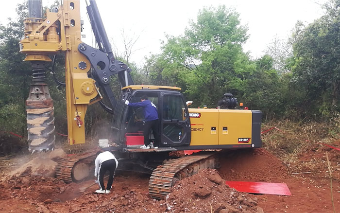 現(xiàn)場施工樁徑1000mm左右,樁深7.5-13m,徐工XR138F日鉆孔達20m??蛻糍潎@道:“徐工產(chǎn)品設備穩(wěn)定,成孔精度高,施工效率快,值得信賴!”
