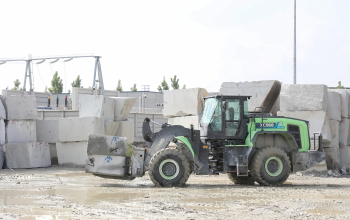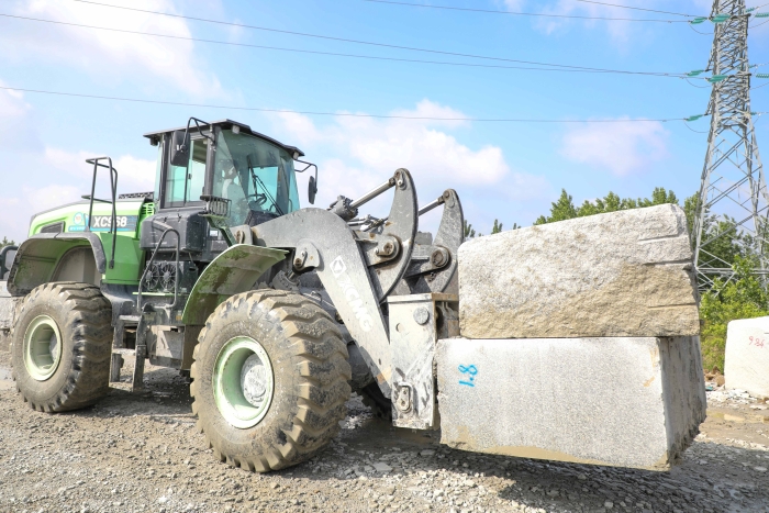 華中腹地,某大型石材加工內(nèi),全球首臺(tái)徐工XC968EV-T20純電動(dòng)石材叉裝機(jī)在原石堆放區(qū)輾轉(zhuǎn)騰挪,高效完成著原石卸貨,整理碼放及轉(zhuǎn)運(yùn)上料等工序。連續(xù)不斷的電機(jī)蜂鳴聲,演奏著建設(shè)綠色未來的樂章。