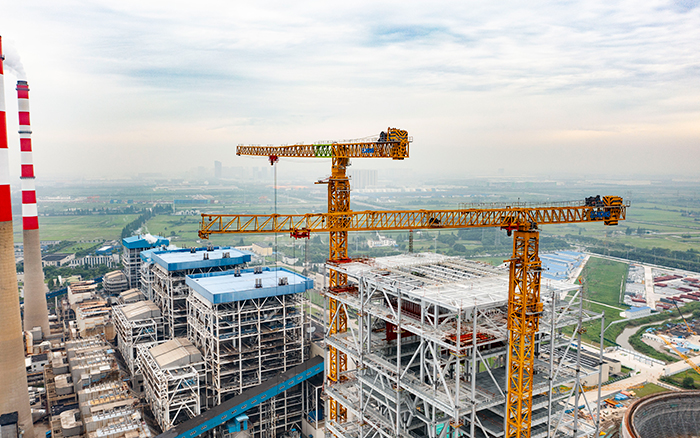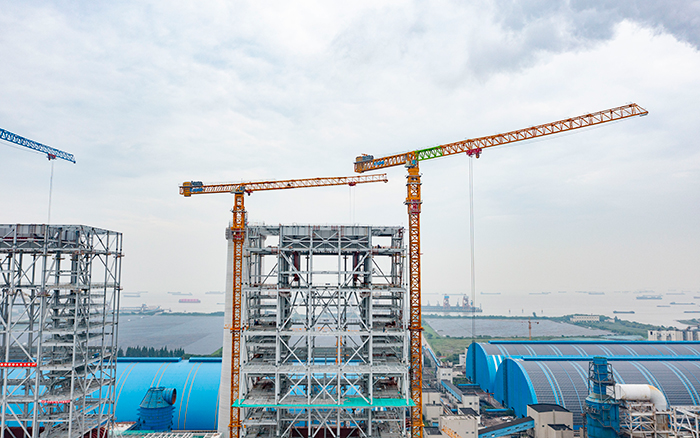 側望長江畔,機器轟鳴、江水潺潺,華能太倉電廠機組擴建項目施工現場一派繁忙景象,XGT3100-160S、XGT1350-64S兩臺徐工超大塔穩(wěn)穩(wěn)矗立在高聳的鋼架間吊裝作業(yè)。