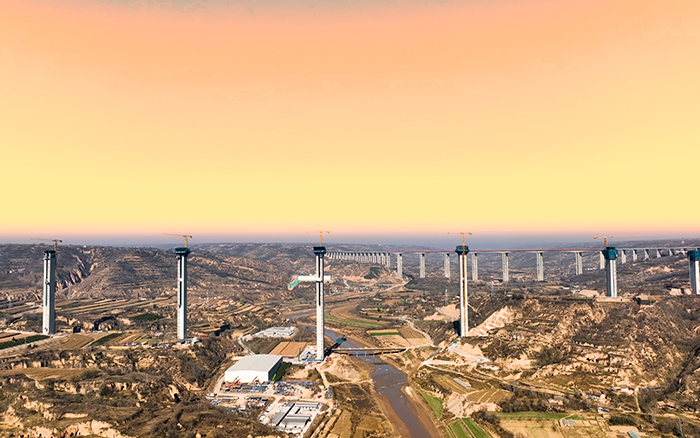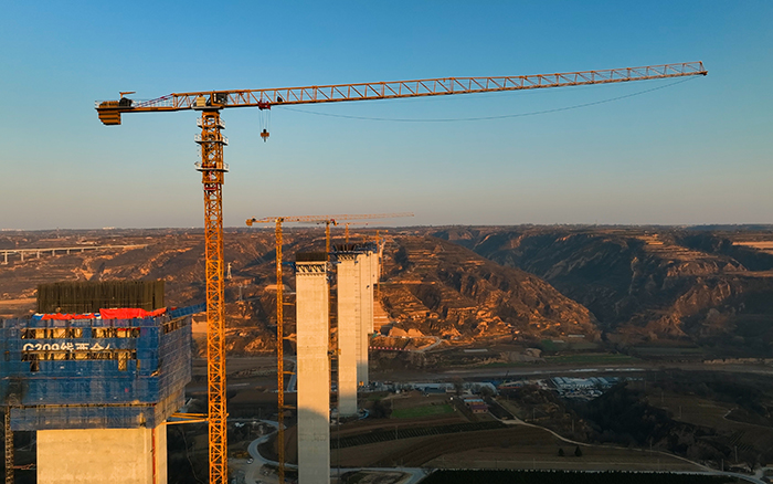 在廣袤的隴東地區(qū),穿過層層大霧,俯瞰馬蓮河特大橋項目,徐工群塔似根根“擎天柱”矗立在黃土高原上。