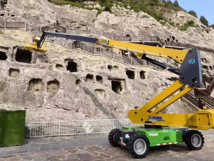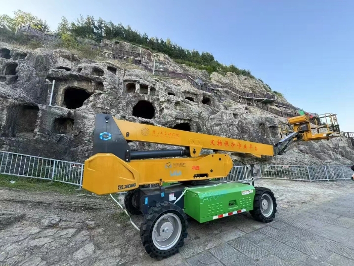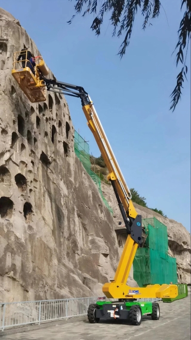 時(shí)間回溯到2021年,由于遭受多場(chǎng)暴雨侵襲,龍門(mén)石窟部分洞窟內(nèi)滲漏水嚴(yán)重甚至出現(xiàn)積水,部分山體表面巖石脫落、松動(dòng),嚴(yán)重威脅文物安全,急需得到有效治理。龍門(mén)石窟研究院隨即開(kāi)展了為期1年多的“龍門(mén)石窟蓮花洞至石牛溪區(qū)域保養(yǎng)維護(hù)項(xiàng)目”。徐工XGS25ACK-Li直臂式高空作業(yè)平臺(tái)作為“得力助手”,深度參與各項(xiàng)保護(hù)修復(fù)工作。