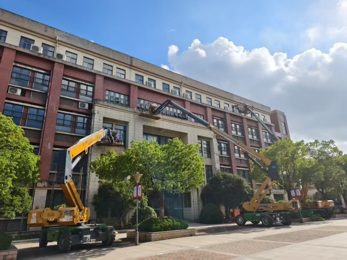 此次施工通過(guò)使用徐工高空作業(yè)設(shè)備,有效避免了傳統(tǒng)腳手架對(duì)校園場(chǎng)地占用大、搭設(shè)周期長(zhǎng)的影響,體現(xiàn)了現(xiàn)代化施工設(shè)備在校園維修改造中的顯著優(yōu)勢(shì)。