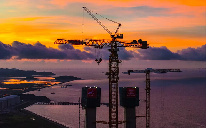 在封頂作業(yè)中,徐工塔機將百噸構(gòu)件以毫米級精度吊裝至200余米高空,硬剛10級海風(fēng),創(chuàng)造了海上橋梁建設(shè)新紀錄。多臺群塔協(xié)同作業(yè),創(chuàng)造性攻克"高空精度、抗風(fēng)穩(wěn)性、吊裝效率"三大世界級施工難題,展現(xiàn)了中國裝備的卓越性能。