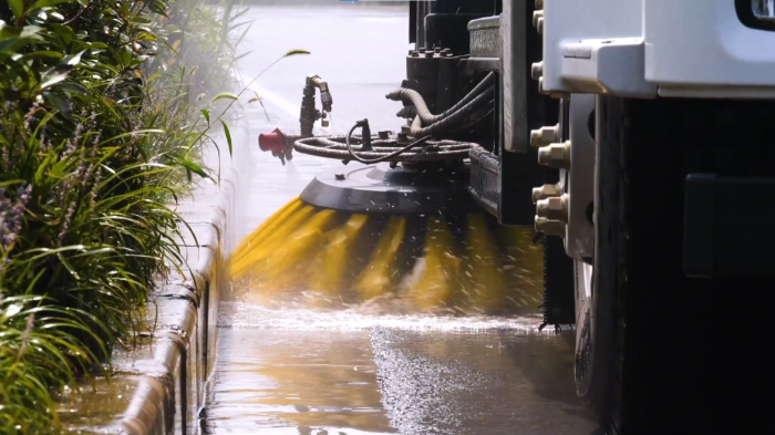 產(chǎn)業(yè)區(qū)周邊道路:運(yùn)輸車輛頻繁出入,易產(chǎn)生碎屑、油污。洗掃車搭載的高壓水槍與V型噴桿,可對(duì)路面進(jìn)行深度沖洗,油污去除率超95%,避免二次污染。