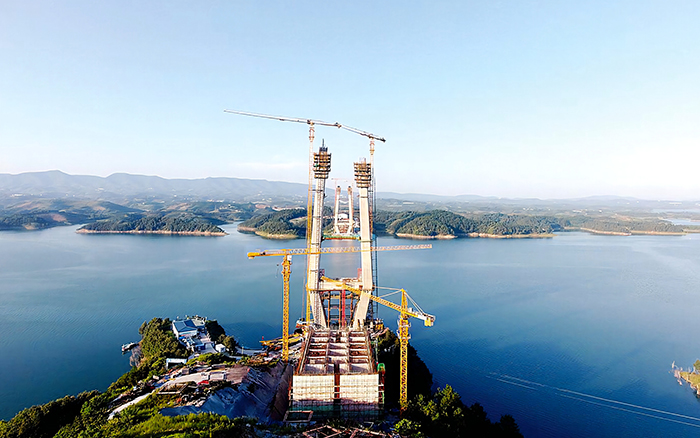 面對(duì)高達(dá)199米的大橋主塔,“徐工金”克服氣候環(huán)境多變、空氣濕潮等不利因素,憑借“精、準(zhǔn)、穩(wěn)”的強(qiáng)悍性能,保障大橋主塔以每天一米的速度節(jié)節(jié)升高,目前大橋主塔已施工過(guò)半。