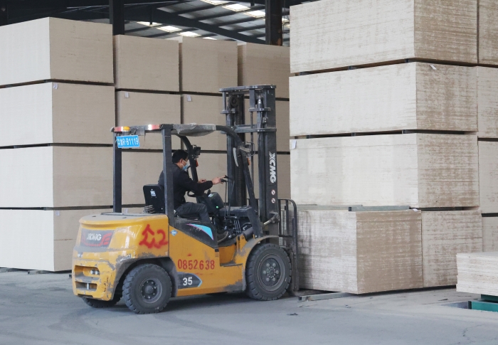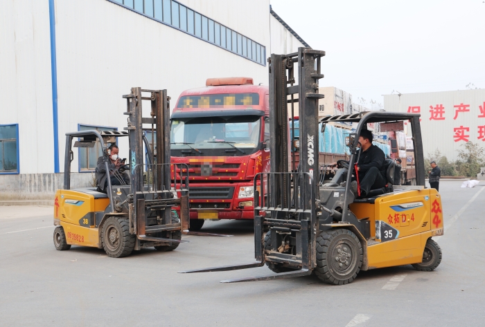 在山東菏澤某大型板材廠內(nèi),二十余臺(tái)徐工鯤鵬叉車、新E叉車組成的"黃金戰(zhàn)隊(duì)",以高效穩(wěn)定的作業(yè)表