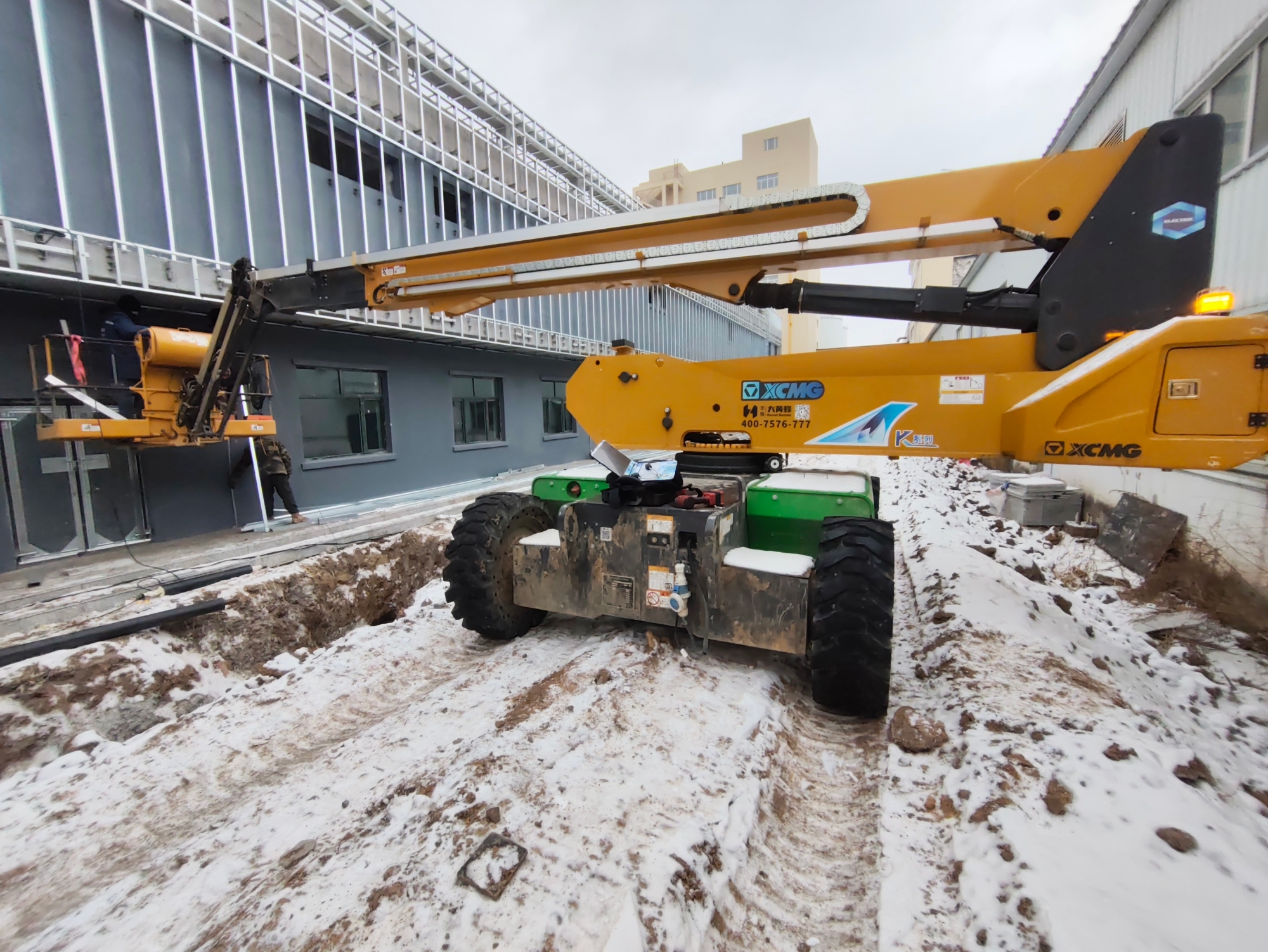 該項目地處嚴(yán)寒的哈爾濱,11月底的施工現(xiàn)場積雪未消、地面濕滑,對設(shè)備的抗寒性能和作業(yè)穩(wěn)定性提出極高要求。徐工高空作業(yè)平臺憑借扎實的底盤設(shè)計和抗寒配置,在冰雪場地中靈活移動,臂架精準(zhǔn)伸展至建筑外立面,助力工人完成鋼結(jié)構(gòu)安裝、幕墻搭建等作業(yè)環(huán)節(jié)。即便在低溫環(huán)境下,設(shè)備的液壓系統(tǒng)和操控性能依舊穩(wěn)定,保障了施工流程的連續(xù)性。