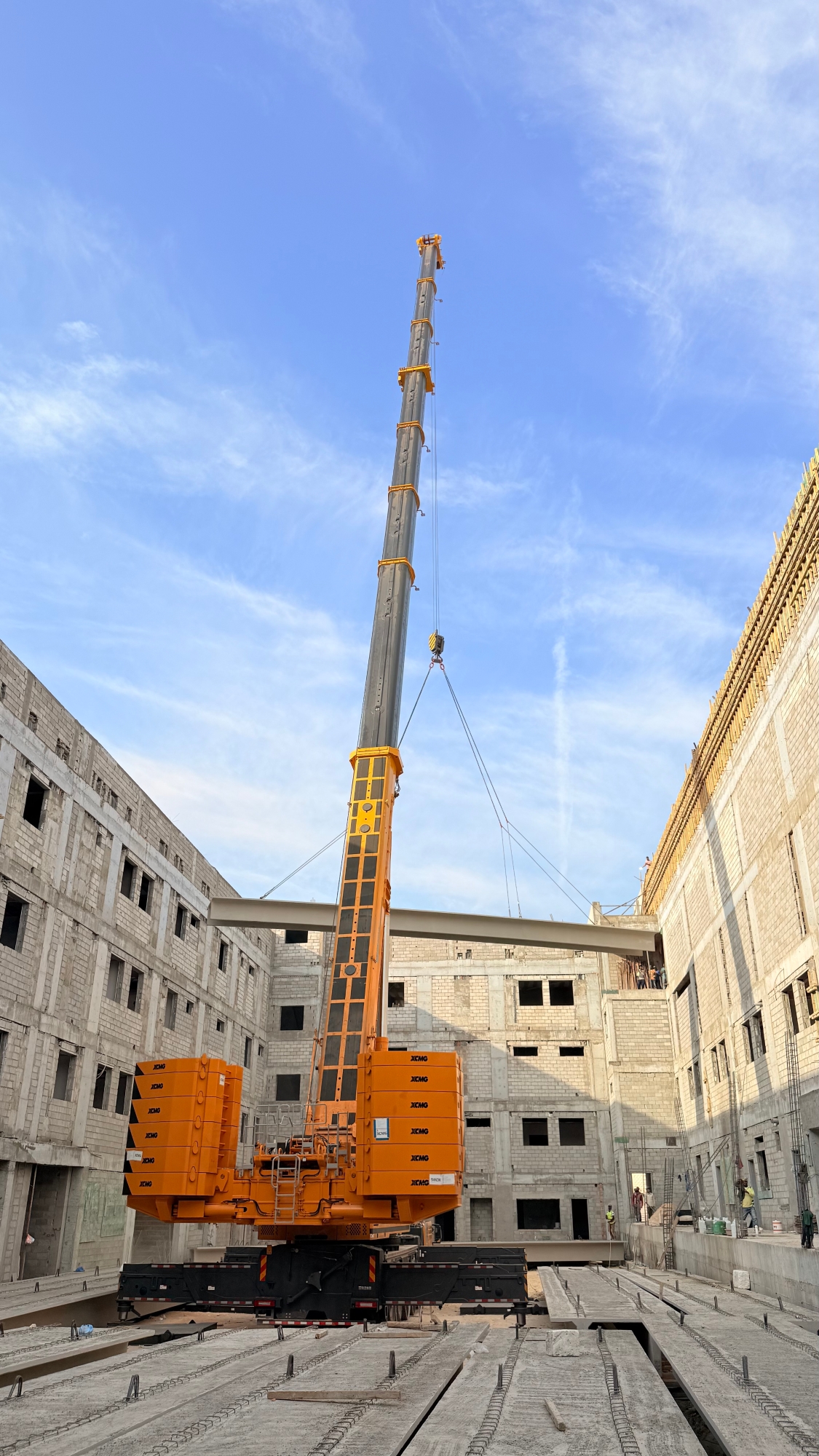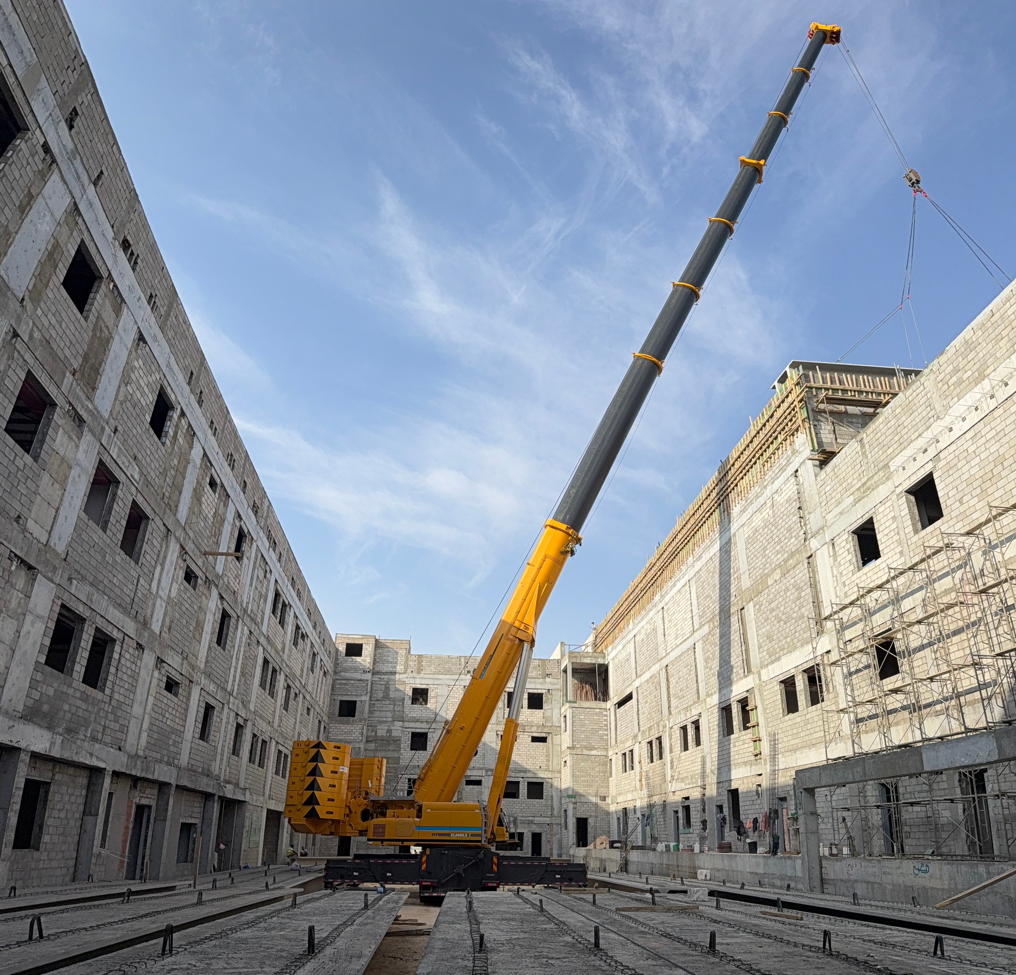 此次施工位于沙特快速發(fā)展的都市區(qū)域,項目本身對工期與精度有著嚴苛要求。高層建筑的樓板吊裝,尤其是對于重量超過十噸的大型預(yù)制構(gòu)件,不僅是對起重機極限載荷能力的考驗,更涉及在復(fù)雜城市空間中的微動操作、抗風(fēng)穩(wěn)定及高空精準就位等一系列高技術(shù)要求。現(xiàn)場空間有限,周邊環(huán)境復(fù)雜,對設(shè)備的機動性、站位適應(yīng)性以及操控的精細度提出了全方位挑戰(zhàn)。
