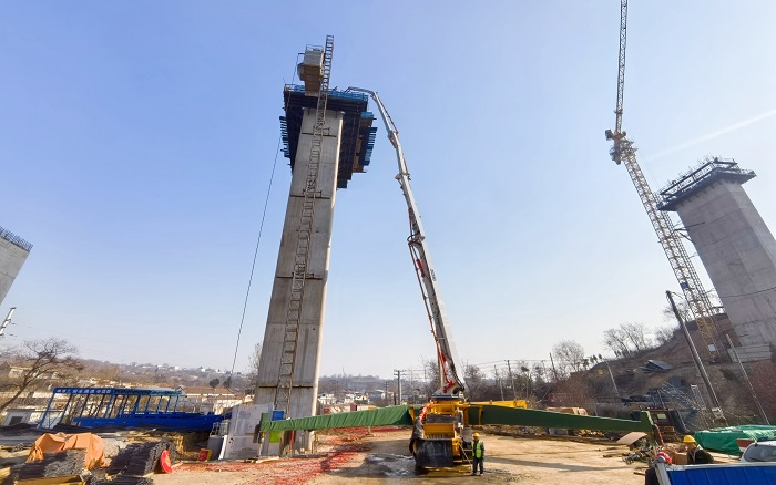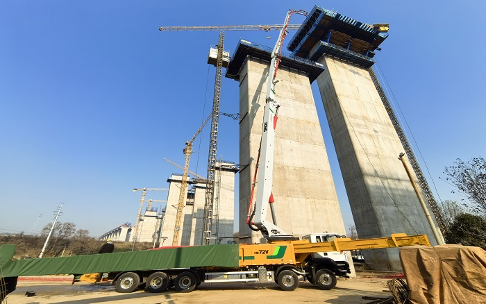 65米高空,72米長臂——在河南焦平高速施工現(xiàn)場,徐工72米泵車以“空中搭橋”之勢攀越橋墩,穩(wěn)穩(wěn)輸送。