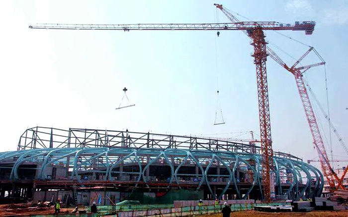滁州奧體中心項目位于明湖景觀區(qū)域,規(guī)劃占地約1100畝,總建筑面積約13.4萬平方米,主要建設項目為一場兩館、含全民健身中心和大型體育生態(tài)公園。徐工塔機多臺XGT7022-12S產品參與滁州奧體中心項目建設,經過近一年的緊張施工,項目主體混凝土施工已基本完成,進入鋼構吊裝建設。