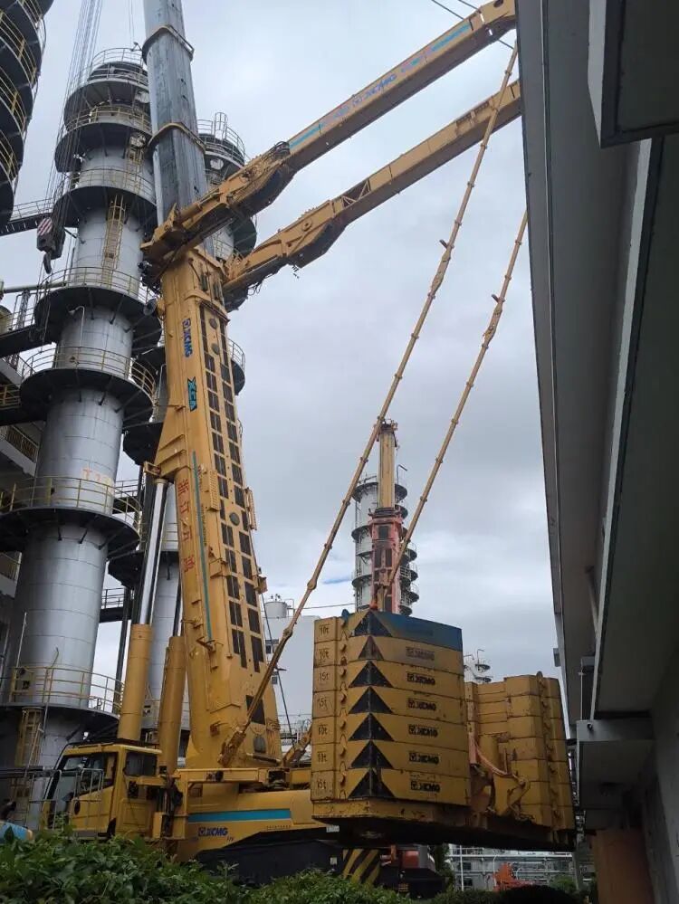 在廣西某石化項(xiàng)目,面對2180噸、高逾百米的2#丙烯塔,挑戰(zhàn)空前:塔體頂部與XGC88000臂桿間隙微弱,周邊管廊密布。